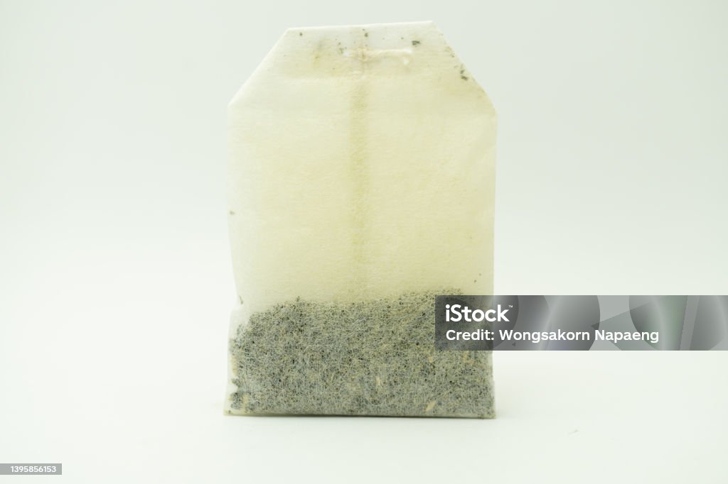 Teabag with green label. Isolated on white background. Close-up of tea bag.